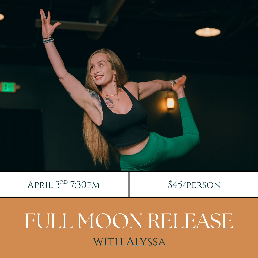A full moon is the perfect opportunity to let go of people, places, and things that are no longer serving us. Alyssa will guide you through an opening introduction and breathwork, followed by journaling, a group meditation to release stagnant energy, and a closing release ritual for anything no longer aligns with our personal lives.This will be a minimal-movement experience. Please dress comfortably and bring a bolster, journal, and pen.